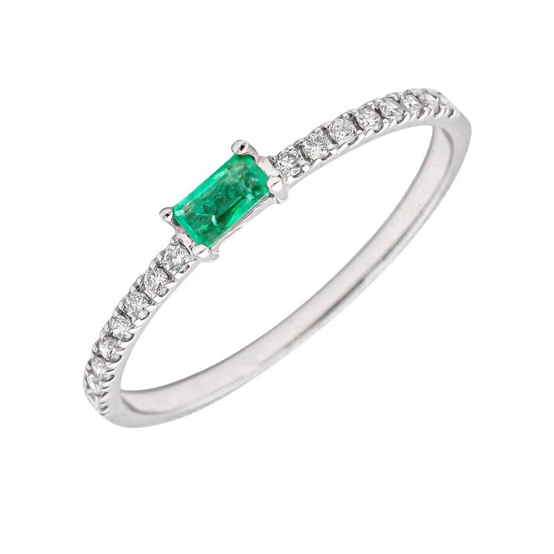 Anillo elaborado en Oro Blanco de Primera Ley 18Kt 750 milésimas con una esmeralda central talla baguette de 0,12ct y 16 diamantes talla brillante con un total de 0,13ct.