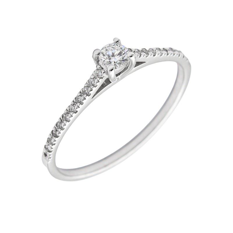 Anillo solitario acompañado 4 garras elaborado en Oro Blanco de Primera Ley 18Kt 750 milésimas con diamantes naturales haciendo un total de 0,21ct.