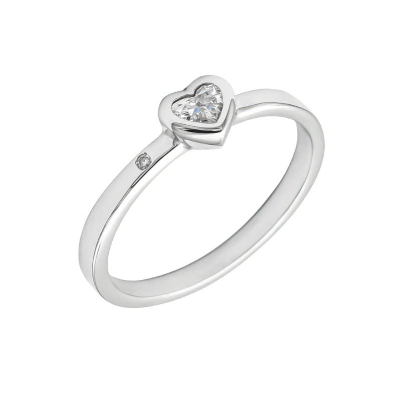 Anillo elaborado en Oro Blanco de Primera Ley 18Kt 750 milésimas con diamante central talla corazón de 0,15ct, más uno en el brazo en talla brillante de 0,01ct, haciendo un total de 0,16ct.