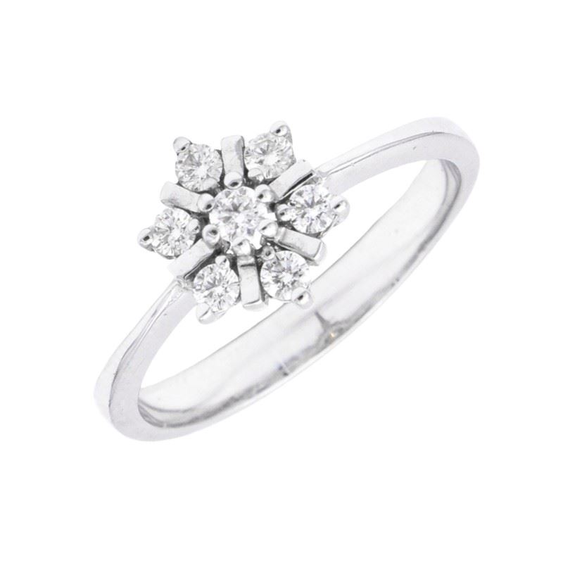 Anillo rosetón elaborado en Oro Blanco de Primera Ley 18Kt 750 milésimas con 6 diamantes talla brillante, con un total de 0,18ct, más un brillante central de 0,05ct.