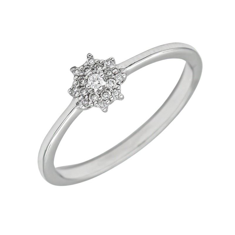 Anillo rosetón elaborado en Oro Blanco de Primera Ley 18Kt 750 milésimas con 17 diamantes talla brillante con un total de 0,09ct.
