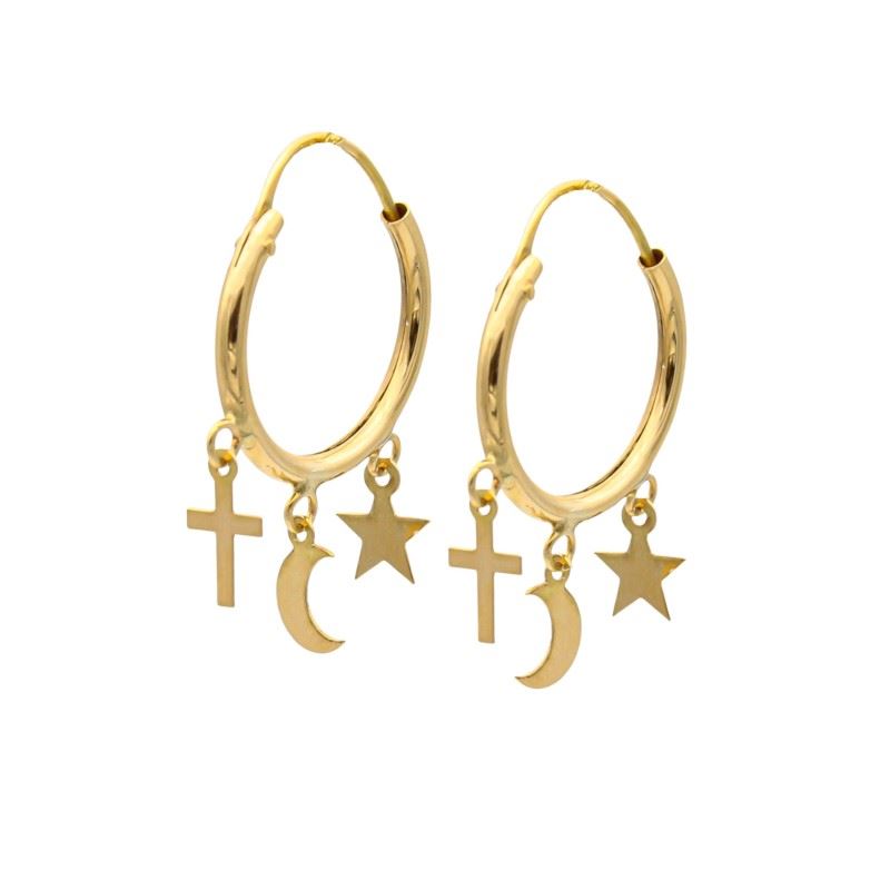 Pendientes aro elaborados en Oro de Primera Ley 18Kt 750 milésimas con 3 charms en forma de cruz, luna y estrella