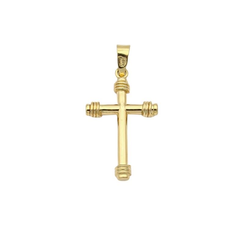 Colgante Cruz tubo elaborado en Oro de Primera Ley 18Kt 750 milésimas con nudos.
