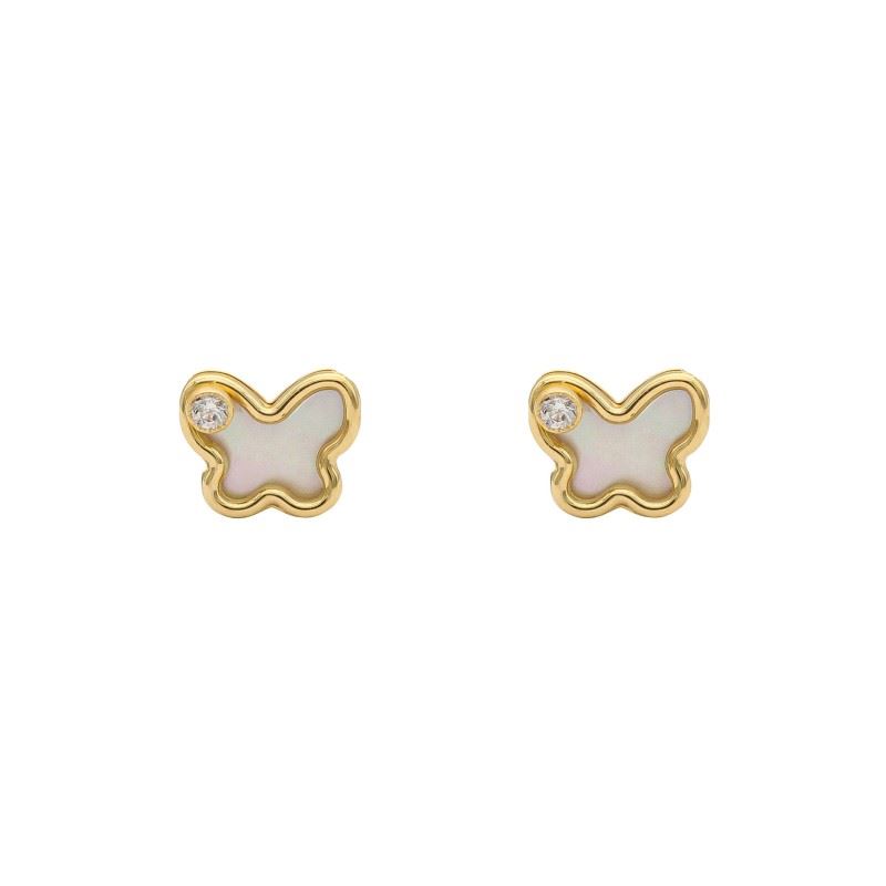 Pendientes mariposa elaborados en Oro de Primera Ley 18K 750 milésimas con nácar y circonita