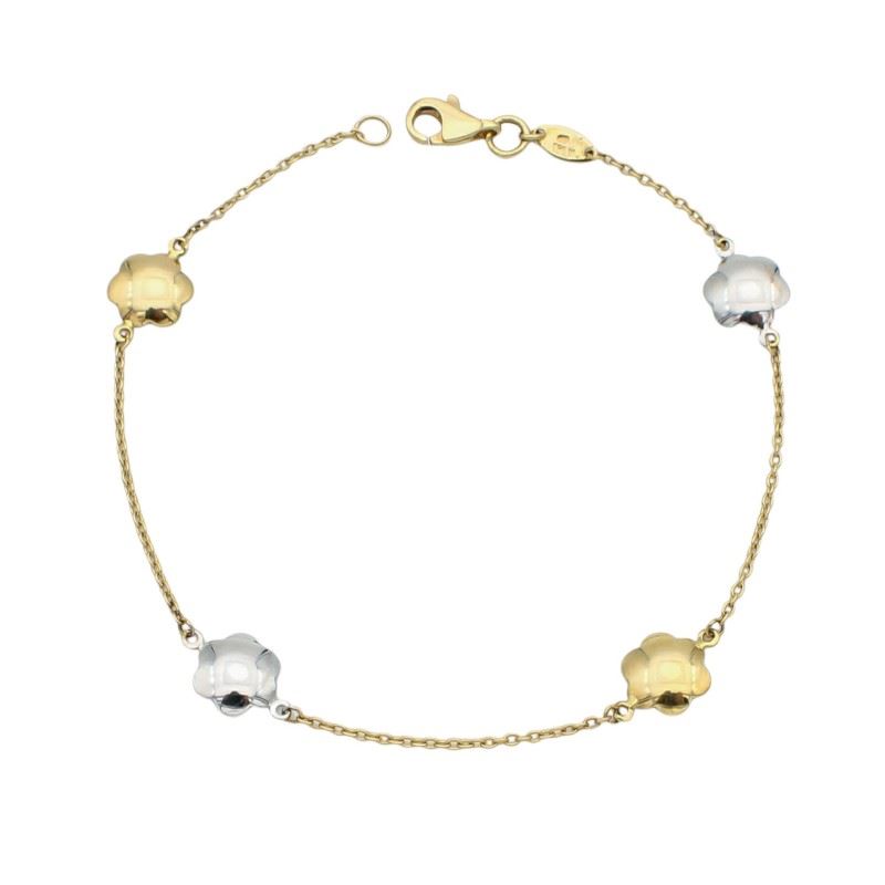 Pulsera elaborada en Oro Bicolor de Primera Ley 18Kt 750 milésimas con 4 charms en forma de flor acabado brillo